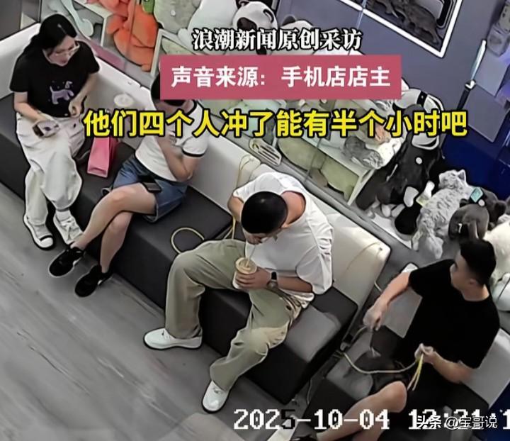 监控显示,10月4日,到网友手机店内充电的有一行四人,这是店主石先生提供的免费充电区域,四人在店中待了半个小时左右。