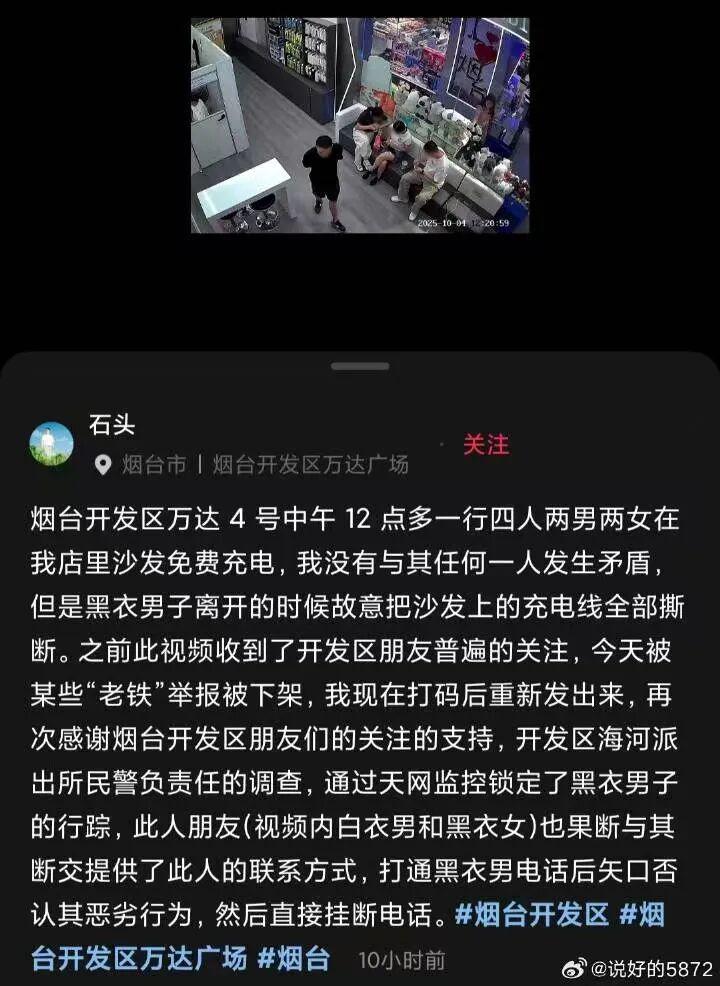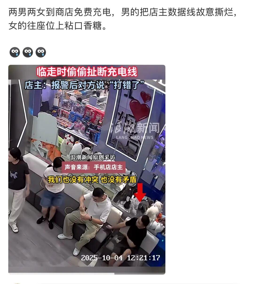 近日,山东烟台某店铺遭遇令人震惊的恶意破坏:四名顾客到店免费充电后,竟将充电线全部撕毁。店主公布的监控视频显示,双方无任何语言交流或利益冲突,行为纯粹出于无端恶意。