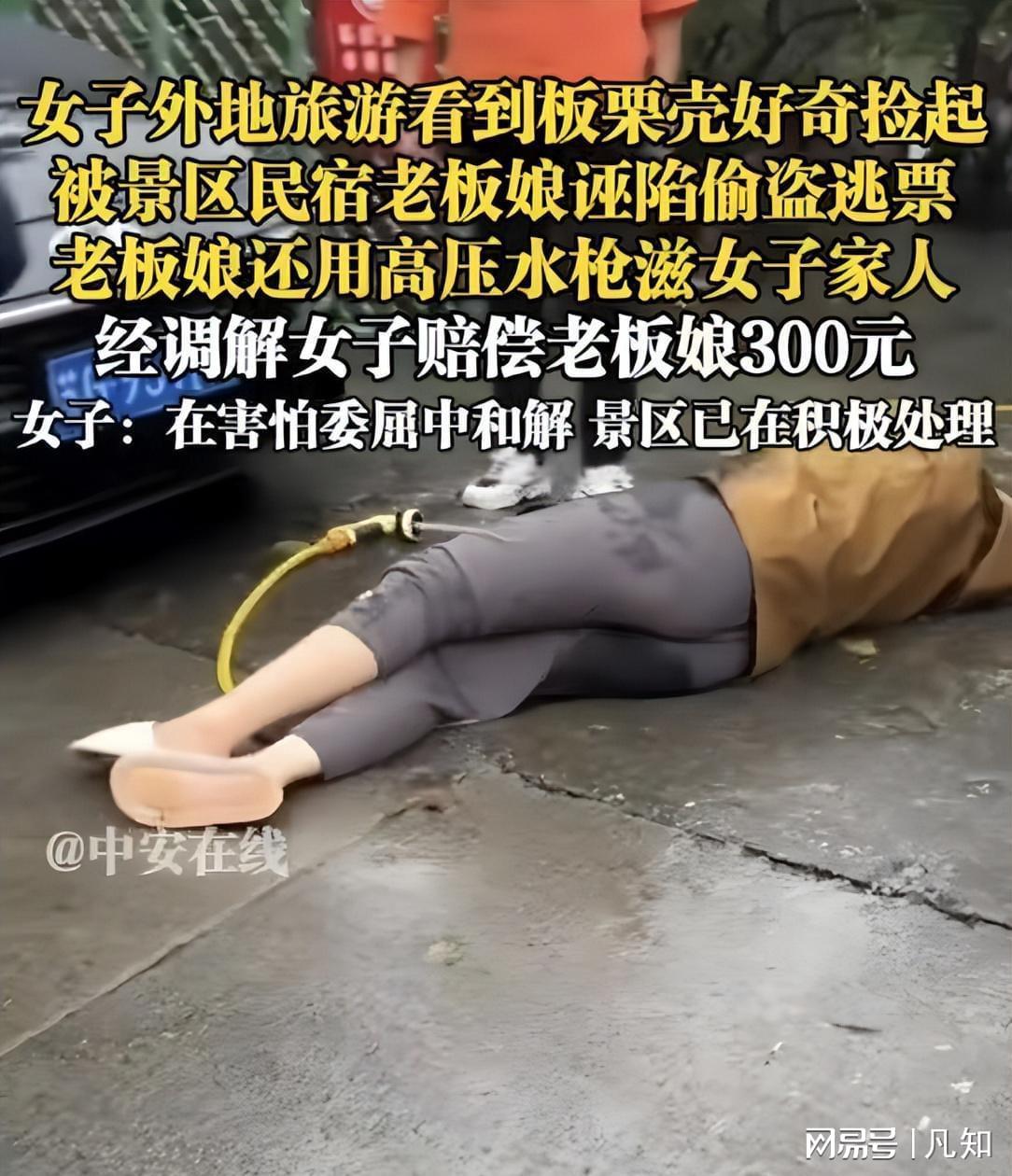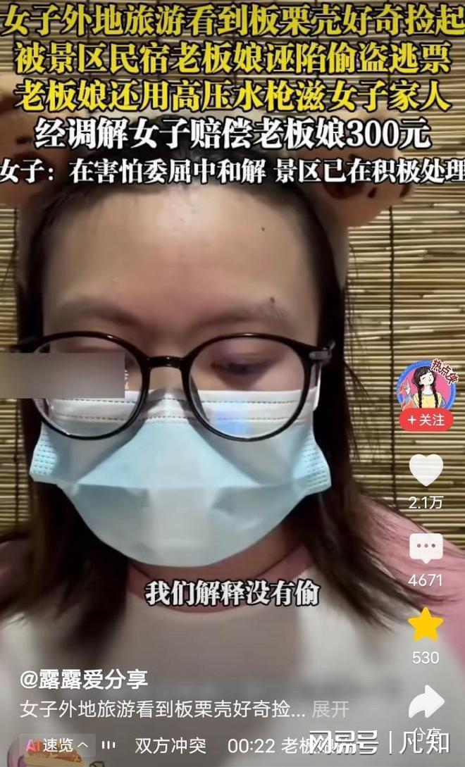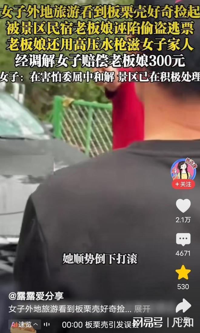 一名女游客带着外婆、妈妈和弟弟来这儿玩,只因好奇捡起地上一颗带壳的板栗,就被民宿老板娘骂成“小偷”,还遭高压水枪当面滋射,最后更在恐惧和委屈中赔偿300元“营养费”。