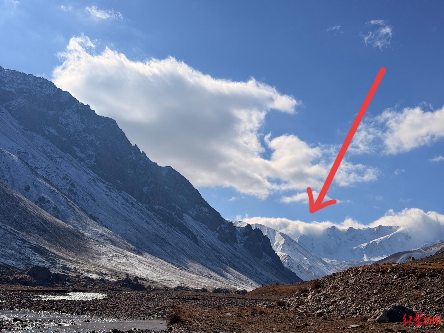 ▲箭头所指即老虎沟垭口。受访者供图