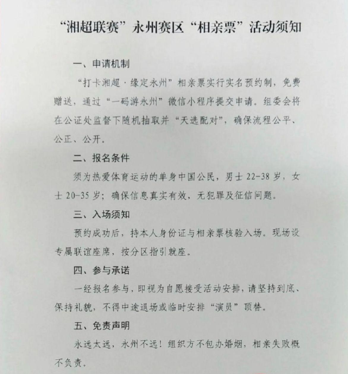 据国内媒体报道,永州足协计划向全国球迷发放300张免费的“相亲票”。为了保持神秘感,报名的球迷在到场前并不知道自己的相亲对象是谁。只有当观众到达球场,领取相亲票并前往专属看台后,才能揭开这个神秘的面纱。