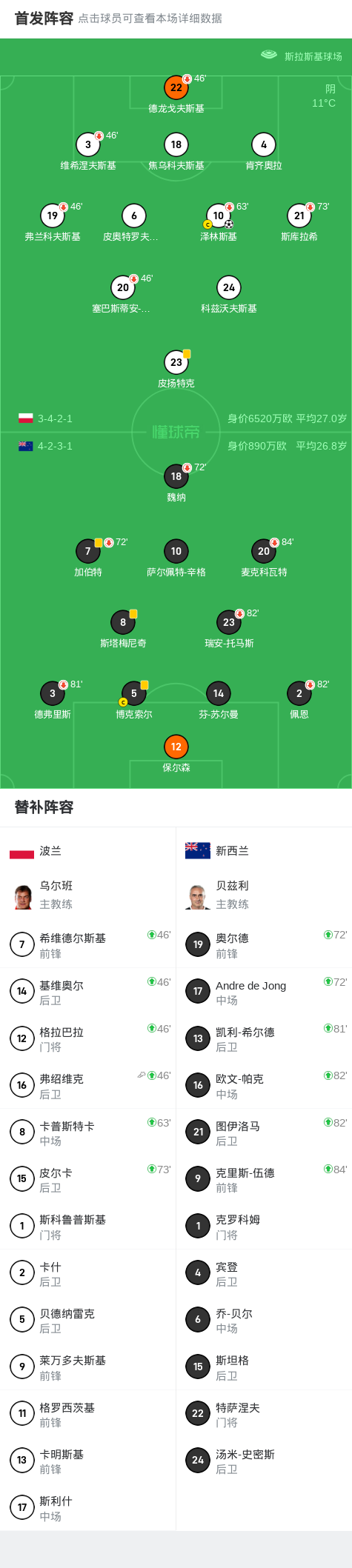 本场比赛中,波兰队和新西兰队都派出了各自的主力阵容。波兰队在进攻端表现出色,尤其是泽林斯基和弗绍维克的配合,成为了球队取胜的关键。而新西兰队虽然防守稳健,但在进攻端缺乏足够的威胁力。