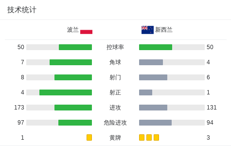 从技术统计来看,波兰队在控球率、射门次数和传球成功率等方面都略胜一筹。而新西兰队虽然在防守端表现出色,但在进攻端的效率有待提高。这场比赛对于双方来说都是一次宝贵的锻炼机会,相信他们在未来的比赛中会有更好的表现。