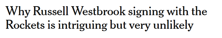 尽管近期威斯布鲁克与休斯顿火箭的流言不断,但知名体育媒体The Athletic通过深入分析指出,其加盟火箭存在三大现实障碍:
