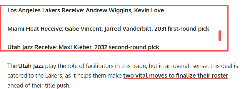 美媒露天看台专栏作家Siddhant Gupta撰文指出,湖人可通过一笔涉及洛杉矶、迈阿密、犹他的三方交易,同时引进维金斯与乐福。具体交易框架如下: