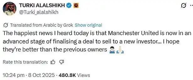 此次收购传闻的核心人物是沙特娱乐局局长、亿万富翁图尔基·谢赫。他在社交媒体上公开表示,希望曼联的新老板能比前任更出色,此言一出立即引爆欧洲足坛。《镜报》跟进报道称,图尔基·谢赫确为潜在买家之一,且正在评估出价。若报价达到52亿英镑,格雷泽家族或将点头同意。