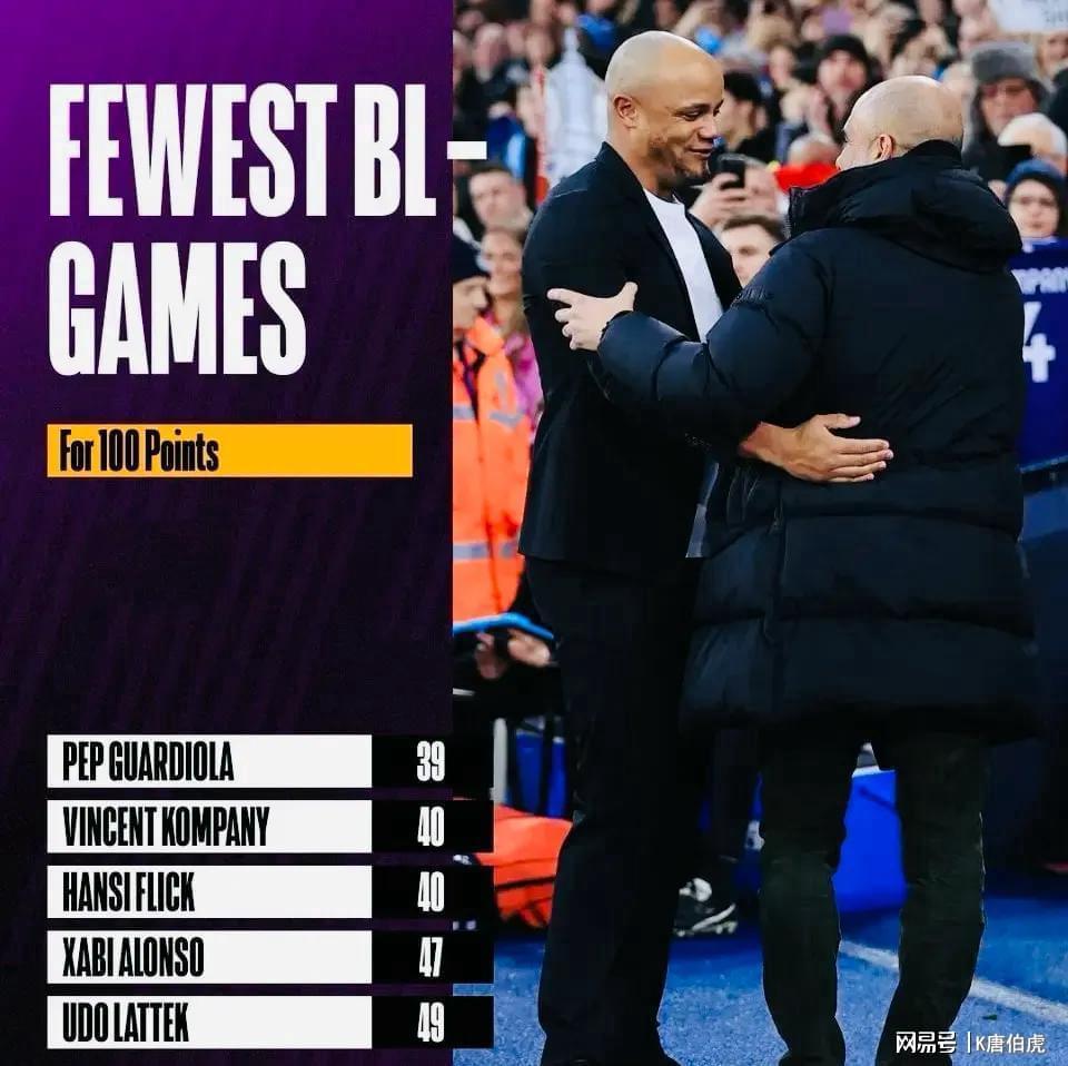 自去年夏天孔帕尼意外接任拜仁慕尼黑主教练以来,他已带领球队征战了40场德甲联赛,累计斩获100分,战绩为31胜7平2负。这一成绩不仅令人瞩目,更在德甲历史上留下了浓墨重彩的一笔——根据德甲官方数据,瓜迪奥拉曾以40场带队获得100分成为最快达成此成就的主教练,而孔帕尼则以39场与弗里克并列第二,展现了其不俗的执教能力。