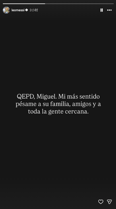 在这悲痛的时刻,阿根廷球星梅西也在社交媒体上发文悼念。梅西在社媒中深情地写道:“QEPD(愿逝者安息),米格尔,向他的家人、朋友以及所有亲近的人致以最深切的哀悼!”梅西的这番话不仅表达了他对鲁索的敬意和哀悼,也传递了他对鲁索家人的关怀和支持。