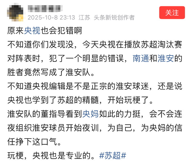 昨日,央视在转播一场足球赛事时出现了重大乌龙,屏幕上误将淮安队显示为晋级球队,而实际上,淮安队已在1/4决赛中被南通队淘汰。