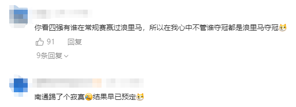 有网友调侃道:“央视玩梗也是专业的”,评论区里满是“浪里马输了足球,赢了央妈”、“央妈也会玩梗了吗?”、“南通踢了个寂寞,结果早已预定。”等幽默评论。