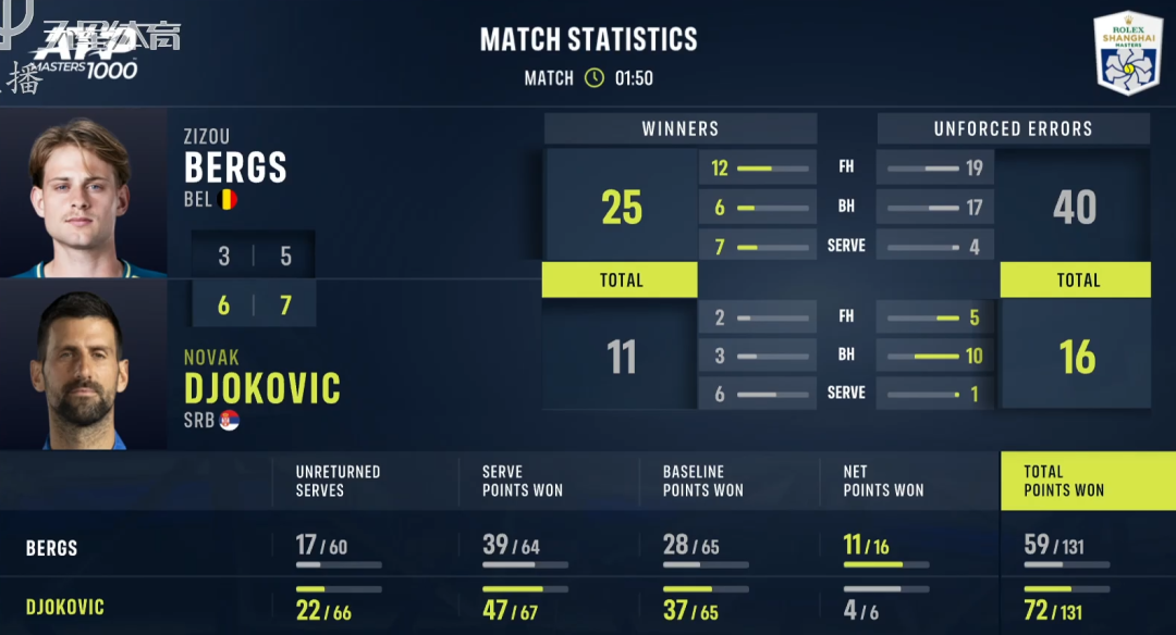 值得一提的是,整场比赛贝尔赫斯轰出25个制胜分,但非受迫性失误高达40次,几乎是德约的3倍。德约则通过稳健的防守和精准的落点控制,让对手自己出现失误,展现了老将的智慧与谋略。