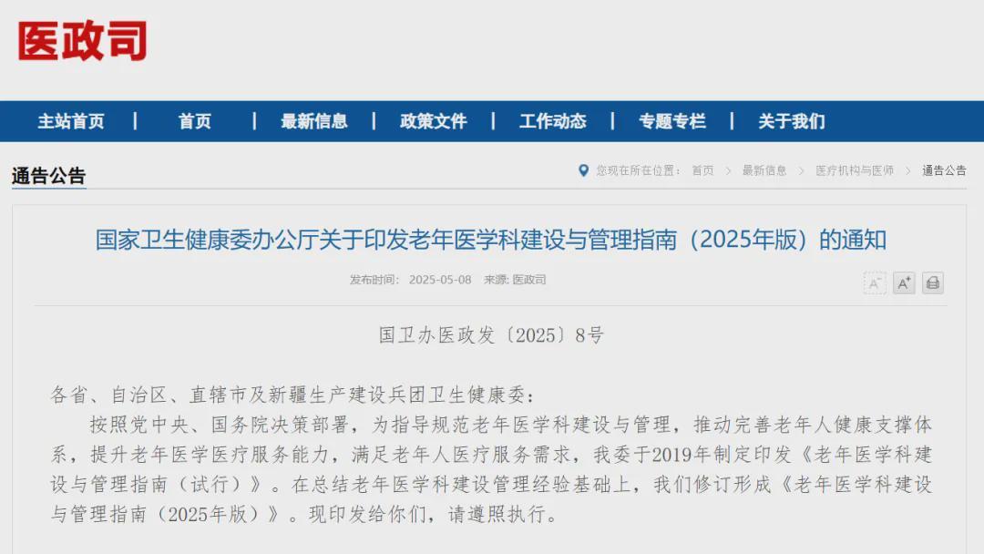 5月8日,国家卫生健康委正式发布《老年医学科建设与管理指南(2025年版)》(以下简称《指南》),明确要求有条件的二级及以上综合医院开设老年医学科,并对科室设置标准、服务模式及人员配备等进行了详细规定,旨在积极应对人口老龄化带来的医疗服务需求。