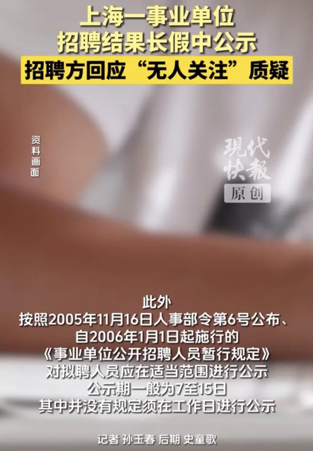 面对质疑,招聘单位10月7日回应称公示完全符合《上海市事业单位公开招聘人员办法》要求。该办法第三十条规定公示期一般不少于7天,但未强制要求必须安排在工作日。
