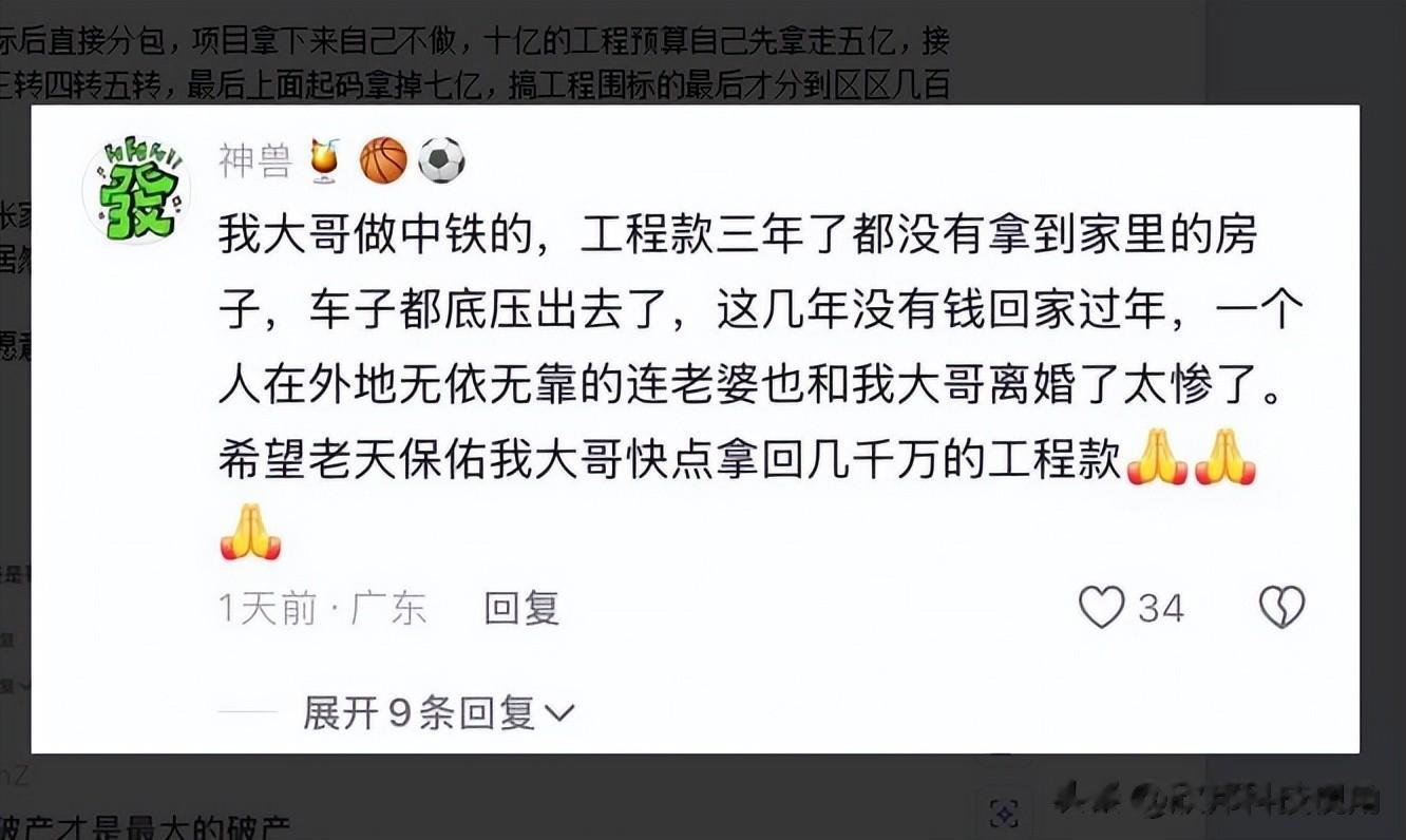 一位网友的亲身经历,更是让人唏嘘不已。他大哥承接中铁项目,工程款一拖就是三年,为筹集资金,家里房子、车子悉数抵押,最终落得个妻离子散、有家难回的悲惨境地。这样的案例,并非个例,而是行业内的普遍现象。