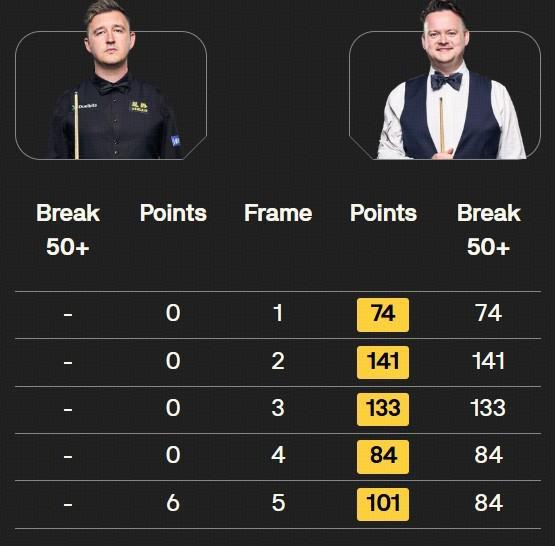 本场比赛中,墨菲攻势如潮,连续轰出单杆74分、141分、133分、84分和84分,五局比赛仅用时不足一小时。威尔逊作为世界顶尖选手,在墨菲的严密防守下几乎无计可施,前四局均以0分告负,创下个人职业生涯罕见低谷。
