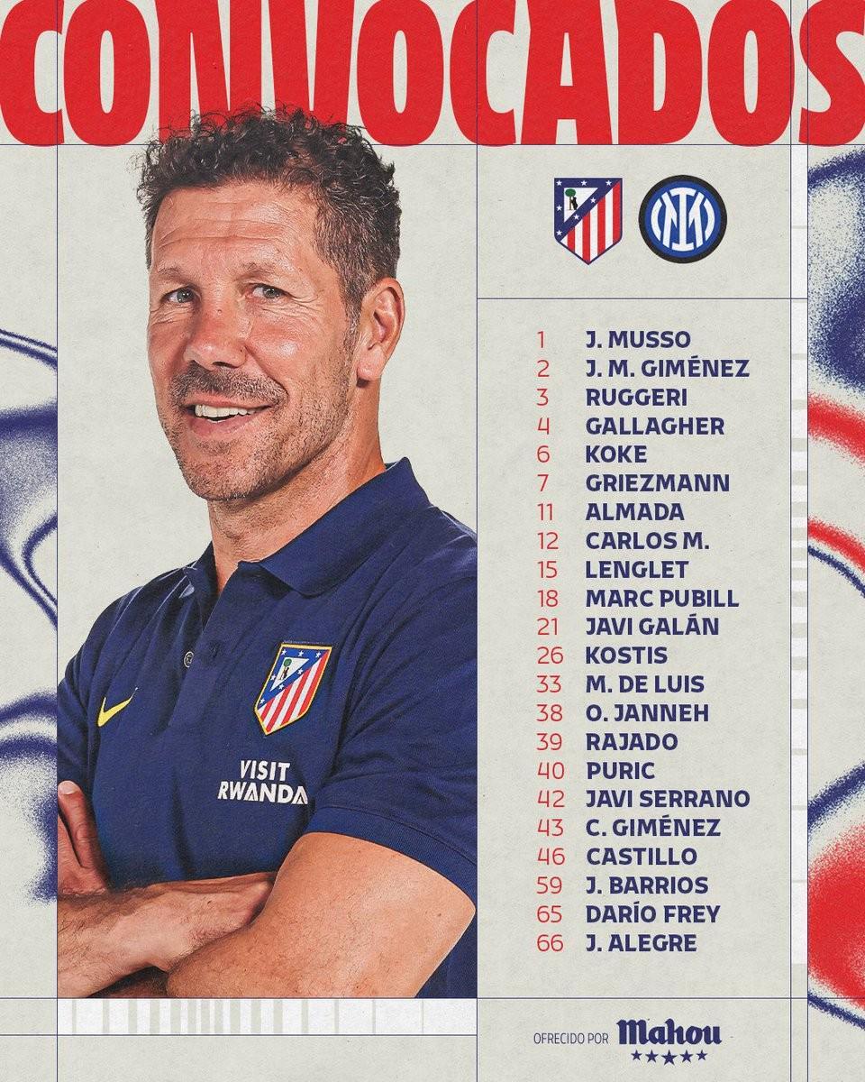 前锋线上:格列兹曼作为球队的进攻核心,将带领阿尔马达、卡洛斯-马丁、奥马尔-詹纳、豪尔赫-拉哈多以及赫苏斯-巴里奥斯等一众锋线新星,向国米的球门发起猛烈冲击。