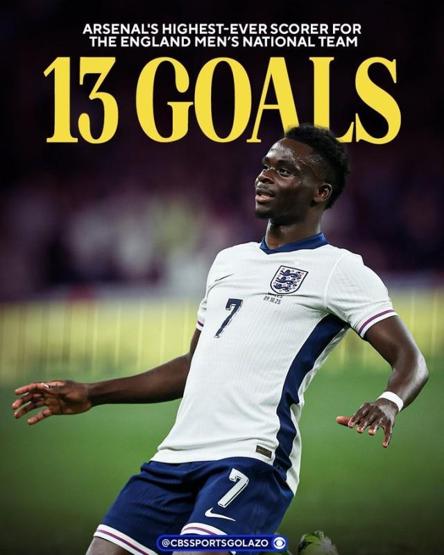 在这场比赛中,萨卡展现出了出色的竞技状态。第20分钟,他抓住机会,冷静射门得分,这是他在国家队生涯中的第13粒进球。这一数字看似普通,却意义非凡,因为它意味着萨卡已经超越了1931-1938年期间效力于三狮军团的克利夫·巴斯廷。巴斯廷在代表英格兰队出战期间,共打入了12粒进球,是此前代表英格兰队进球最多的阿森纳球员。而萨卡的这一粒进球,成功打破了尘封86年的纪录,让他成为了代表英格兰队进球最多的阿森纳球员,荣膺三狮队史阿森纳第一射手。