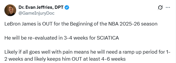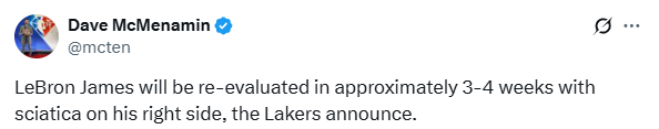 北京时间10月10日,据湖人随队记者Dave McMenamin报道,湖人官方正式宣布:当家球星勒布朗·詹姆斯因右侧坐骨神经痛将再休战3-4周,这意味着他将生涯首次缺席常规赛揭幕战。此前,詹姆斯已连续22次出战揭幕战,这一纪录将在本赛季终结。