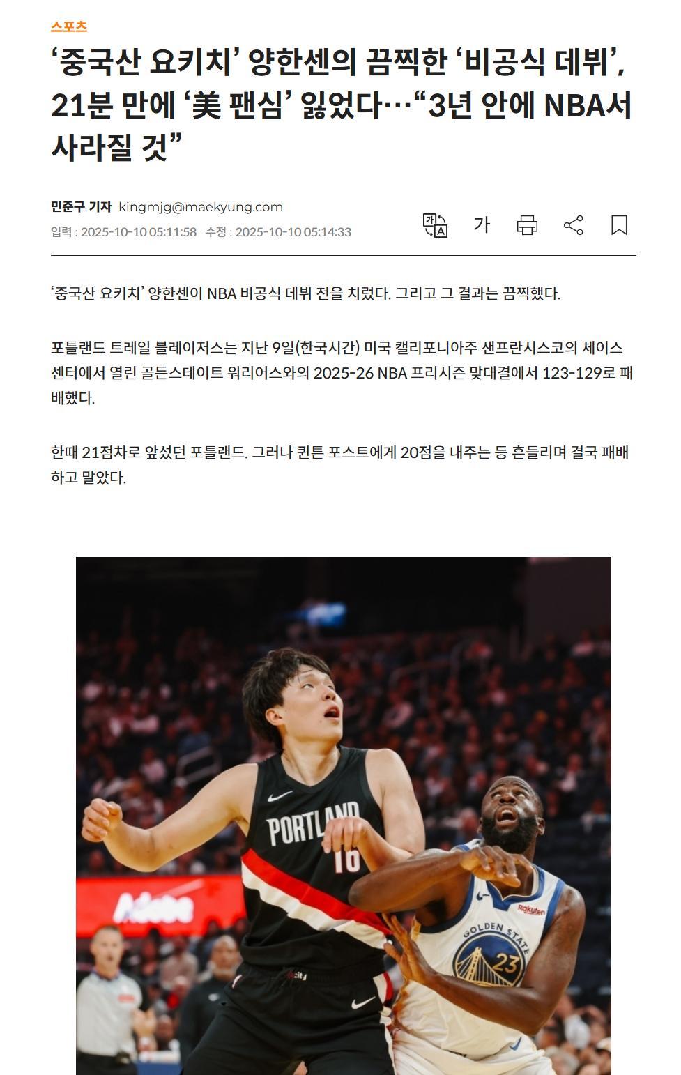 随着比赛结果的尘埃落定,韩国媒体也迅速加入了讨论行列。他们在社交平台上发表了一篇针对杨瀚森首秀的文章,引用了国外网友的尖锐评论,直言这位被誉为“中国约基奇”的年轻球员,将在三年内从NBA赛场上消失。这样的言论无疑给本就压力山大的杨瀚森又添了一把火。