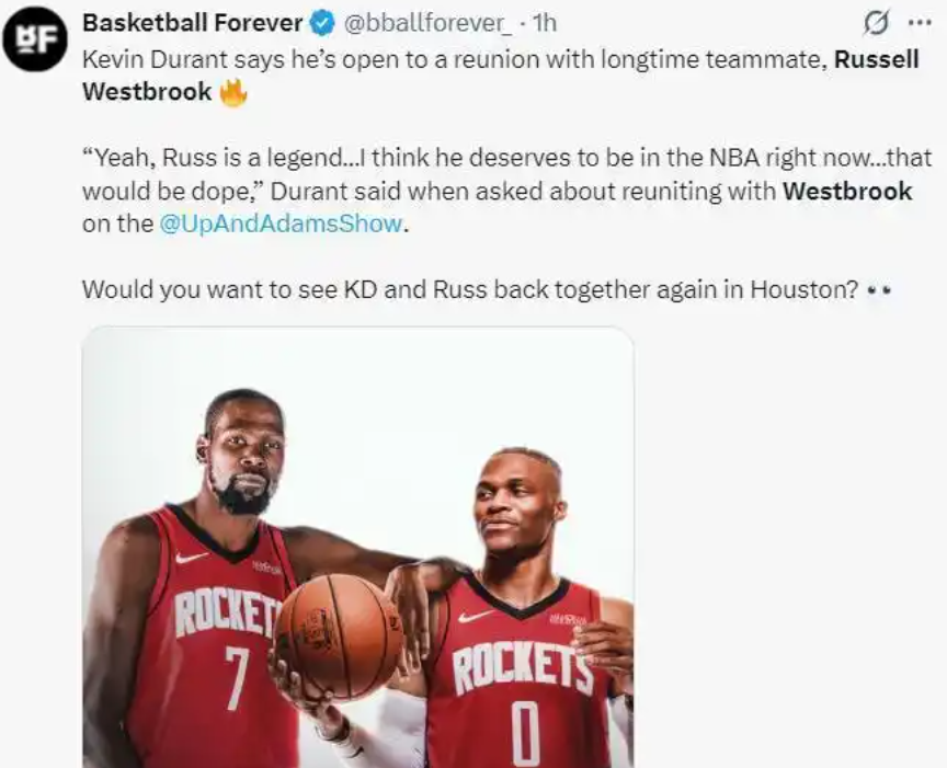 近期,杜兰特在播客节目中也谈到了威少的情况:“拉塞尔(威少)是传奇,我认为他现在理应留在NBA,也该用自己想要的方式结束NBA生涯。”当被问及威少是否会加盟火箭时,杜兰特表示他完全不清楚,也没向任何人打听过,这件事根本没被提上议程。