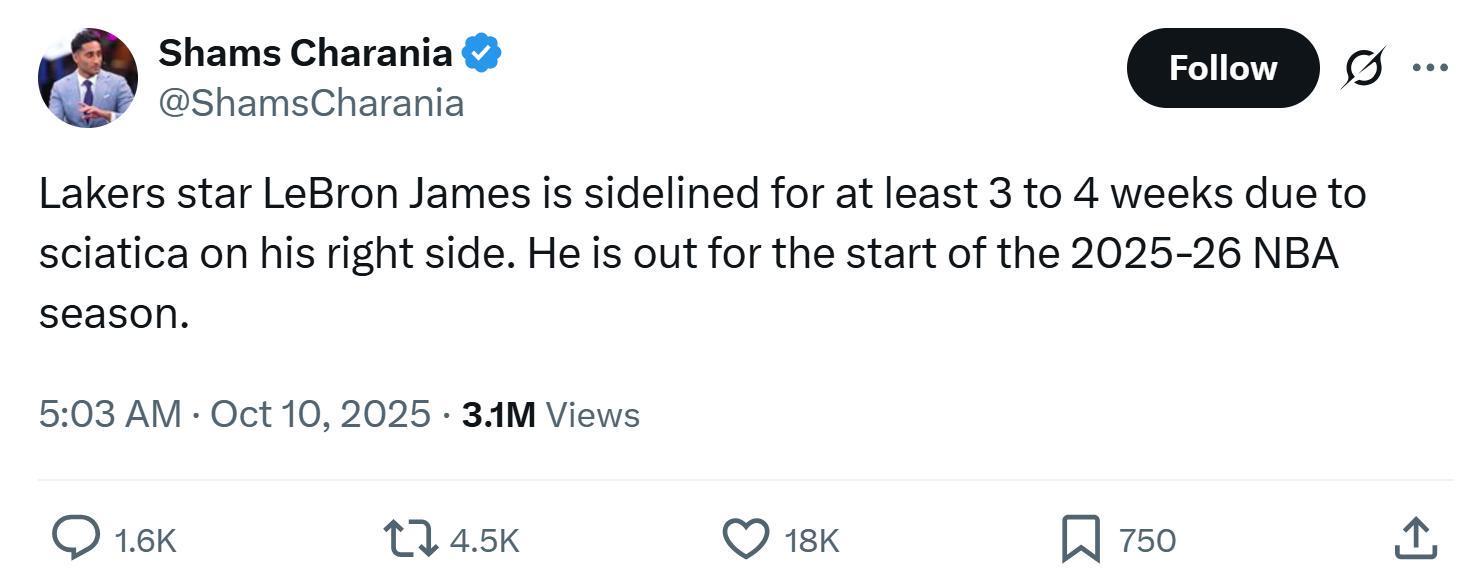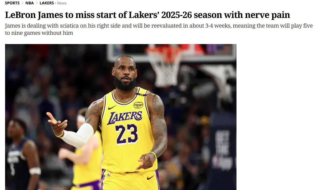 在季前赛如火如荼进行之际,ESPN知名记者Shams爆料称,湖人队的锋线核心詹姆斯遭遇了右侧坐骨神经痛,这不仅将使他缺席新赛季的揭幕战,更可能在新赛季初期至少缺阵3-4周的时间。