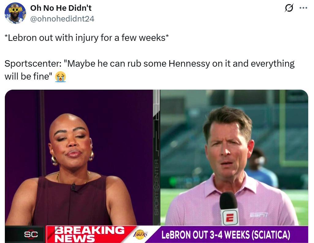当詹姆斯伤病恢复不理想的消息曝出后,他并未获得外界的同情,反而遭到了ESPN记者Matt Barrie的调侃。Matt Barrie在直播节目中谈到这一话题时,公开调侃道:“他或许应该往患处抹点轩尼诗,没准就好了!”