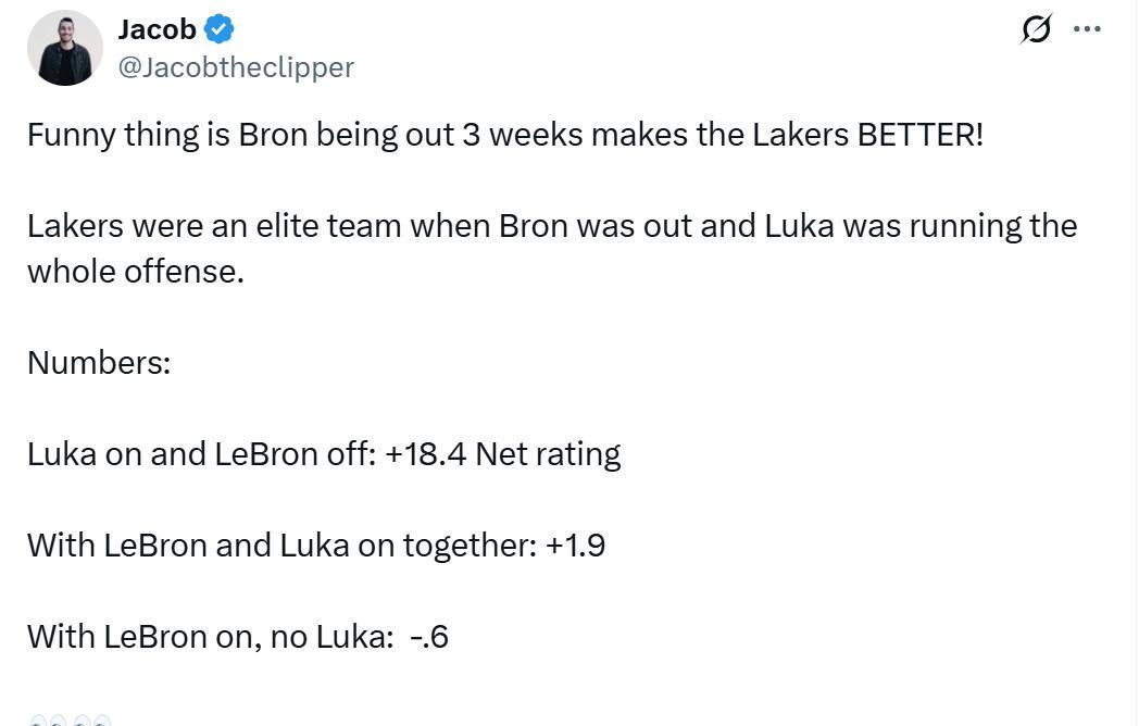 另外一项数据也具备一定的参考价值。上个赛季东契奇加盟后,当詹姆斯与东契奇同时登场时,球队的净效率为+1.9;有詹姆斯无东契奇时,净效率为-0.6;有东契奇无詹姆斯时,净效率为+18.4;而当两人都不在场时,净效率依旧达到+4.4。