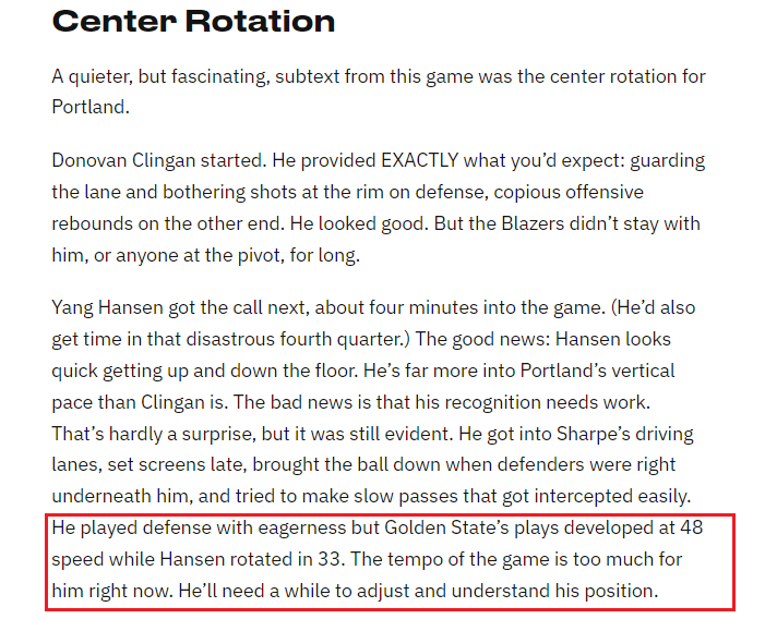针对杨瀚森的表现,开拓者跟队记者戴夫·戴卡德撰文进行了深入解析。他特别提到了中锋轮换的片段,并指出杨瀚森虽然跑动速度不慢,但场上意识却显得滞后,暂时还跟不上NBA快节奏的比赛。