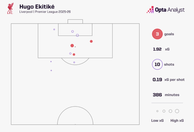 在伊萨克加盟前,法国前锋埃基蒂克已用表现征服安菲尔德:默西塞德德比制胜球、联赛杯绝杀南安普顿,3个非点球进球领跑队内射手榜。62.5%的过人成功率与场均0.45非点球预期进球值,证明其兼具得分与创造威胁能力。尽管伊萨克到来后出场时间压缩,但其爆发力仍能在关键时刻改变战局。
