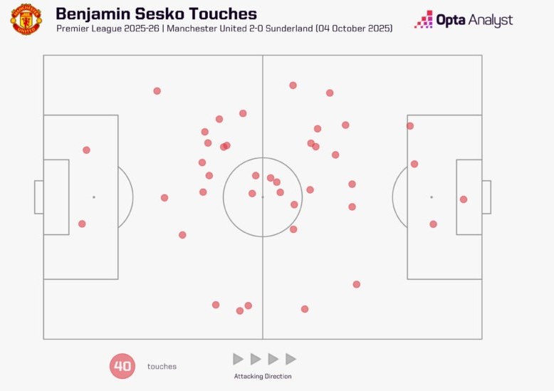 8场2球的表现未达预期,但曼联整体进攻体系不成熟限制其发挥。开放式传中次数仅列联赛第10,削弱其头球优势。然而,创造5次机会位列中锋前三的做球能力,6次射门进球的布伦特福德之战,以及40次触球的桑德兰之战,证明其支点作用正逐步释放。33.8公里/小时的冲刺速度与细腻脚下技术,使其成为曼联为数不多的亮点。