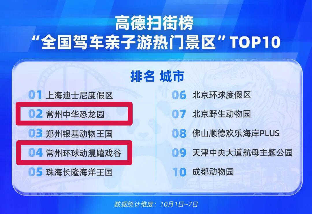 “高德扫街榜”公布“全国十大驾车亲子游热门景区”TOP10,常州两大景区上榜。