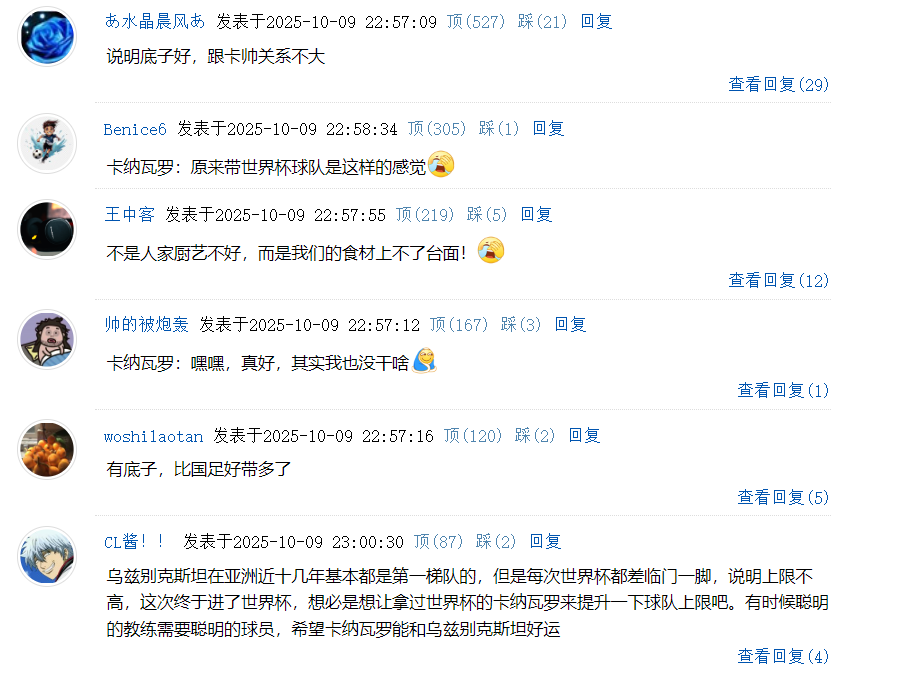 有球迷调侃道:“卡纳瓦罗:嘿嘿,真好,其实我也没干啥!”还有球迷表示:“说明底子好,跟卡帅关系不大!”更有球迷分析道:“乌兹别克斯坦在亚洲近十几年基本都是第一梯队的,但是每次世界杯都差临门一脚,说明上限不高。这次终于进了世界杯,想必是想让拿过世界杯的卡纳瓦罗来提升一下球队上限吧。有时候聪明的教练需要聪明的球员,希望卡纳瓦罗能和乌兹别克斯坦好运!”