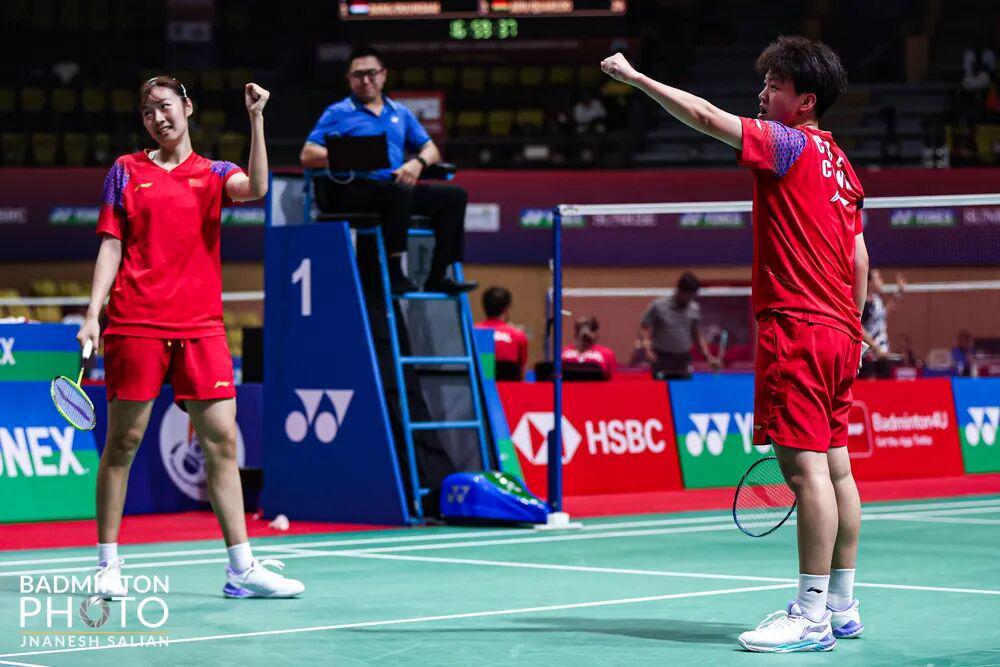 第二盘开始,双方在一局男单中均换人出战。刘洋名宇开局稍显慢热,以7比9落后于对手。随后混双比赛中,马来西亚组合又以9比8的微弱优势胜出,总比分以18比15领先。然而,进入男双比赛后,再次上场的陈俊廷/刘峻荣吹响了反击的号角,打出12比4的得分高潮,帮助队伍以27比22反超。最后两局比赛中,徐文婧和曹梓涵/陈樊淑湉顶住压力,先后以36比32、45比43守住优势,最终帮助中国队以大比分2比0获胜,成功晋级四强。