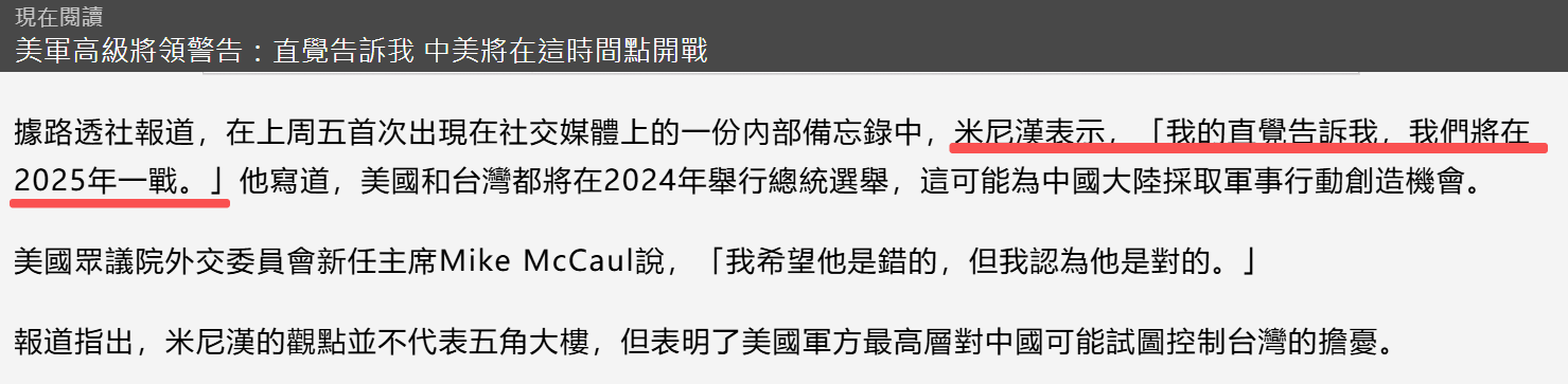 2023年报道,美军将领:中美可能要在2025年开战