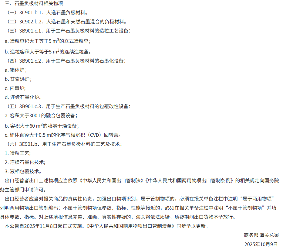 电知家消息,2025年10月9日,中国商务部与海关总署联合发布重要公告,宣布自2025年11月8日起,对锂电池、人造石墨负极材料及其相关物项实施出口管制措施。这一决定标志着中国在新能源产业关键技术领域的出口管理迈出重要一步。