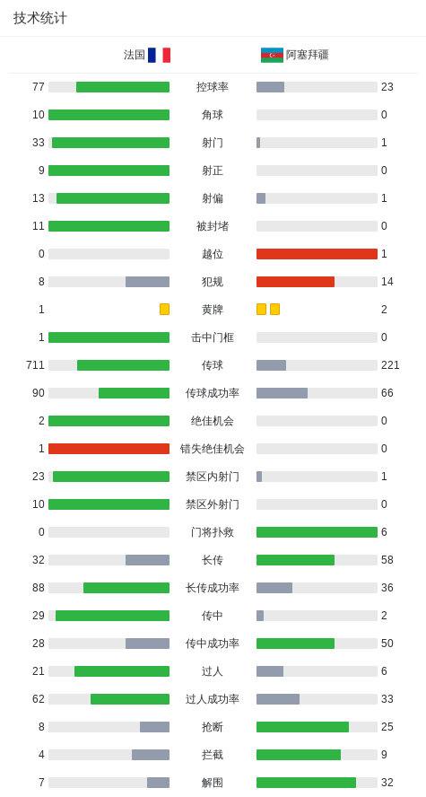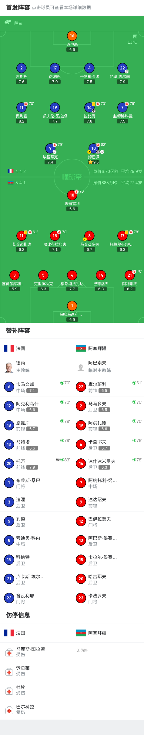 在世界杯欧洲区预选赛第一阶段小组赛第7轮的焦点对决中,法国队坐镇主场迎战阿塞拜疆。凭借姆巴佩的传射建功以及拉比奥、托万的破门,法国队以3-0的比分轻松取胜,继续在积分榜上保持领先。