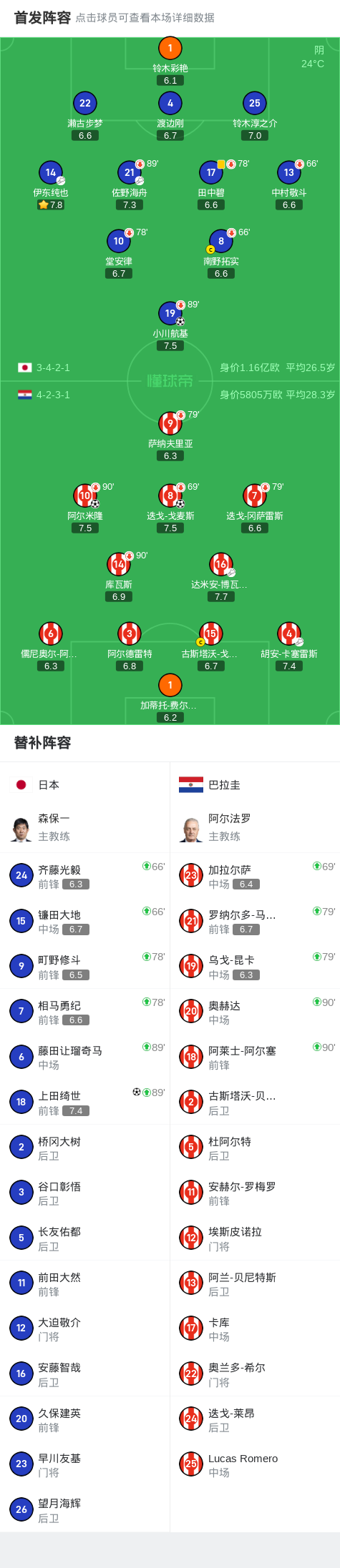 第21分钟,阿尔米隆空中停球后扫射得分,巴拉圭1 - 0领先日本