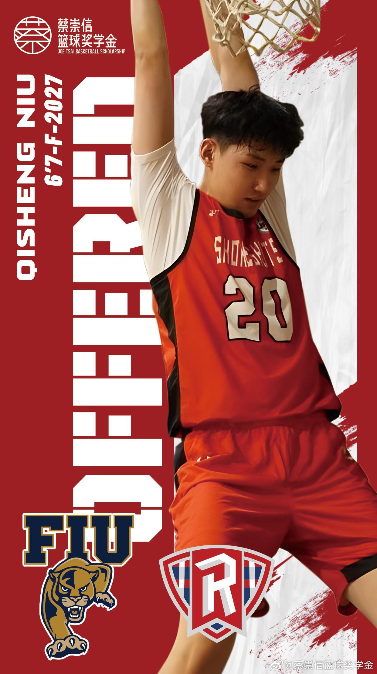 公开资料显示,牛麒晟出生于2007年,身高200cm,场上司职前锋位置。作为蔡崇信篮球奖学金2023级学员,他于2023年赴美就读宾夕法尼亚州Phelps高中,系统接受美式篮球训练体系培养。值得关注的是,早在2024年12月,这位潜力新星就已收获瑞德福大学(Radford University)的录取通知,此次再获佛罗里达国际大学青睐,充分展现其竞技实力与发展潜力。