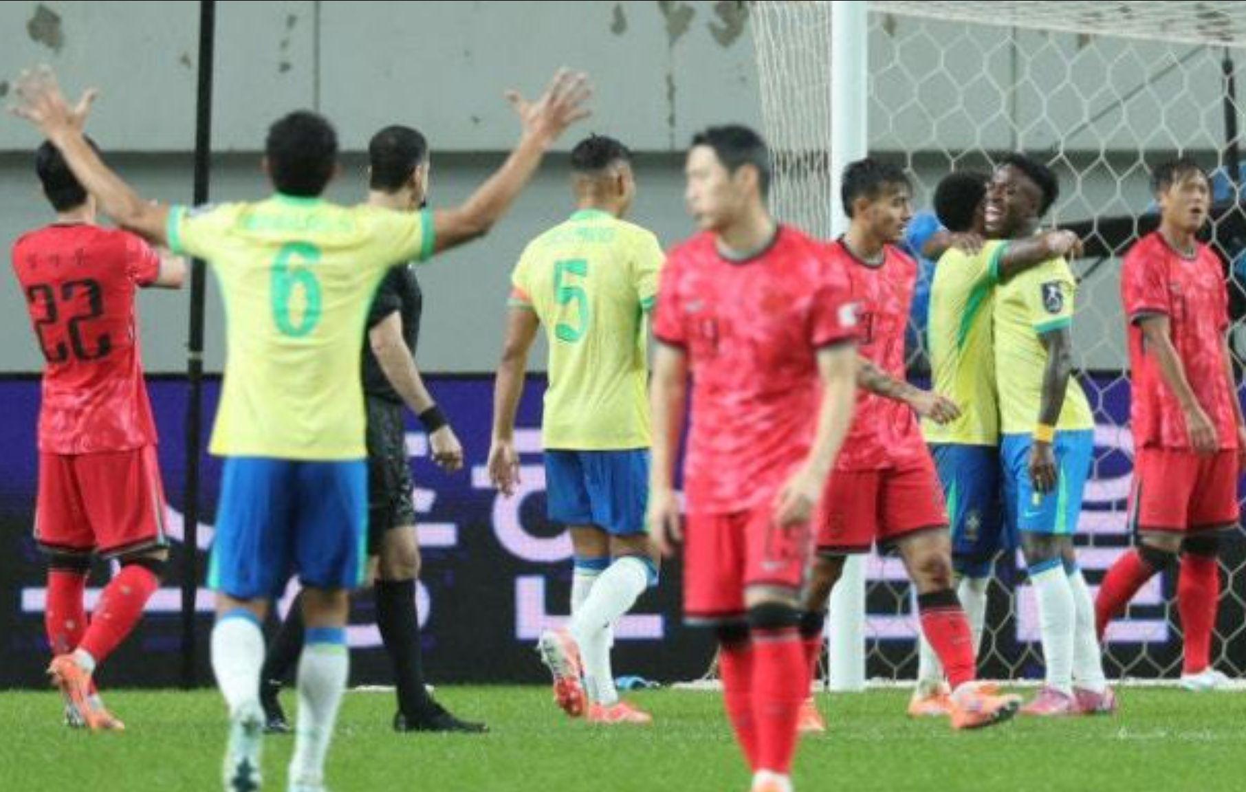 第77分钟,巴西队后场发起快速反击,库尼亚送出一记大师级直塞球,轻松绕过了韩国队的整条防线,维尼修斯带球单刀突进。到了禁区里,维尼修斯戏耍韩国后卫后射门得分,5 - 0!巴西队用一场酣畅淋漓的大胜结束了这场比赛。