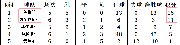 积分榜方面,葡萄牙和西班牙均3战全胜,继续稳稳领跑。土耳其、匈牙利升至小组第二。挪威气势如虹,6轮打入29球,多赛一场的情况下领先意大利6分。K组中,英格兰稳居榜首,阿尔巴尼亚多赛一场仍落后4分。