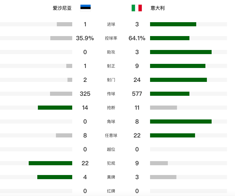 全场比赛,意大利控球率达到62%,射门次数18次其中7次射正,而爱沙尼亚仅有5次射门。角球方面意大利以9-3占据绝对优势。