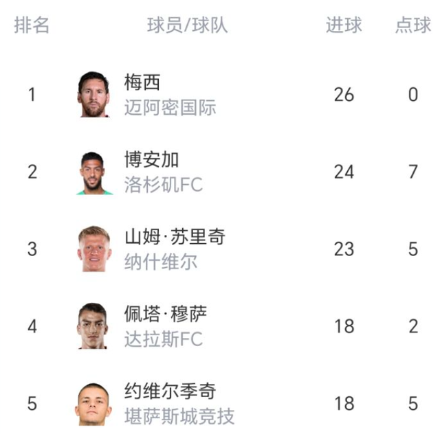 本场过后,美职联常规赛仅剩1轮。迈阿密国际虽已提前无缘常规赛冠军,但梅西的金靴争夺战却迎来曙光。目前,梅西以26球领跑射手榜,领先第二名多球。若末轮继续进球,他极有可能首次捧起美职联金靴。
