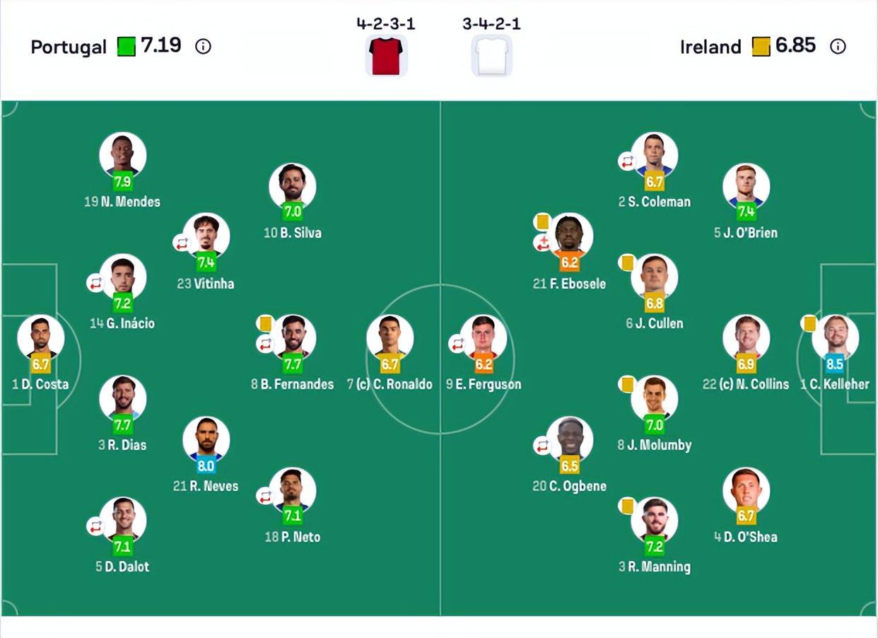 葡萄牙首发:1-迪奥戈·科斯塔、3-鲁本·迪亚斯、5-达洛特(61’16-特林康)、7-C罗、8-B费(86’9-贡萨洛·拉莫斯)、10-B席、14-伊纳西奥(46’13-维加)、18-内托(61’17-莱奥)、19-努诺·门德斯、21-鲁本·内维斯、23-维蒂尼亚(61’2-塞梅多)。