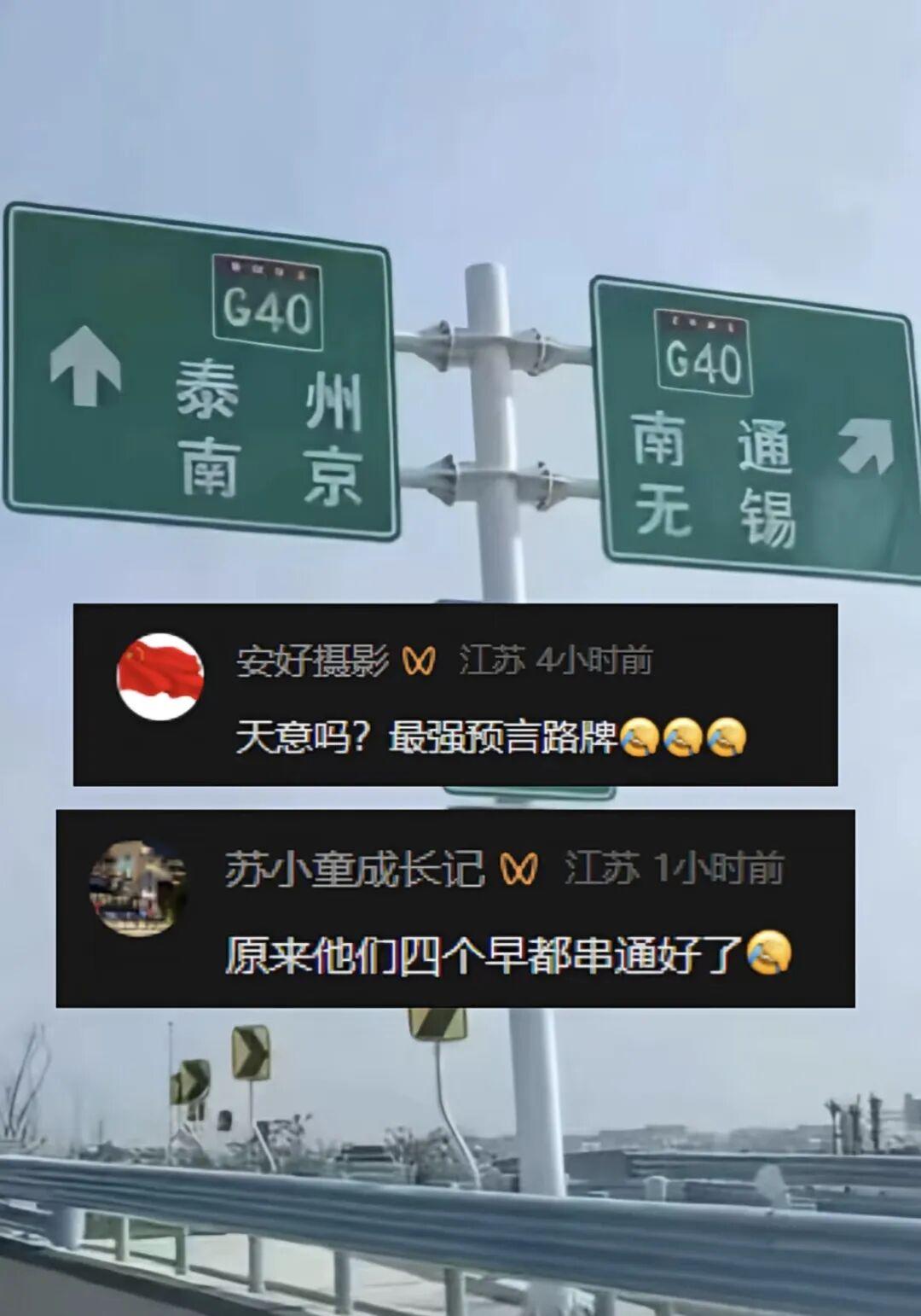 回溯国庆中秋假期期间的四场苏超比赛,跌宕起伏的赛况至今仍让球迷记忆犹新。而近日,一张G40高速路牌的照片在网络引发热议:路牌上标注的“泰州、南京、南通、无锡”四个城市,竟与苏超四强名单完全一致,甚至连对阵分组都暗合赛程安排。