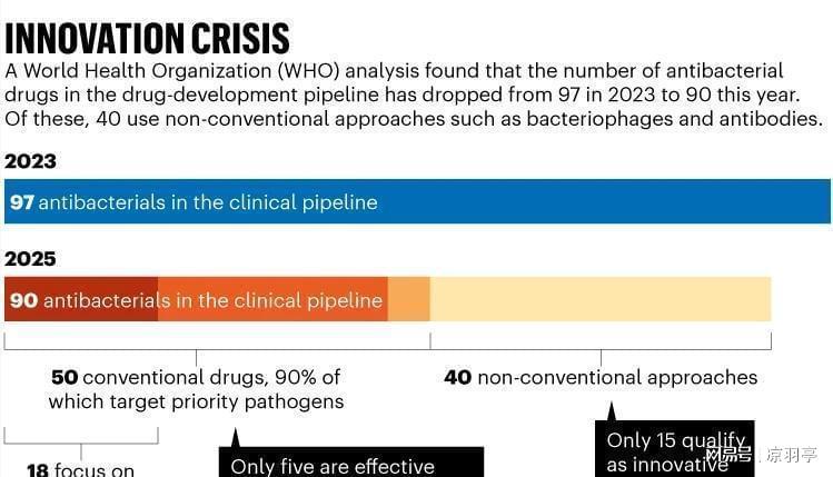 目前,全球在研的抗菌药物总数仅有90种左右,且自去年以来数量持续减少。更令人担忧的是,在这屈指可数的项目中,真正具备创新性的仅有15种。世界卫生组织(WHO)早已列出15种最需要新型药物来对付的耐药菌,并按威胁程度分为三个等级。然而,我们手中能有效对抗那些“关键”优先级病原体的新药,却少之又少。