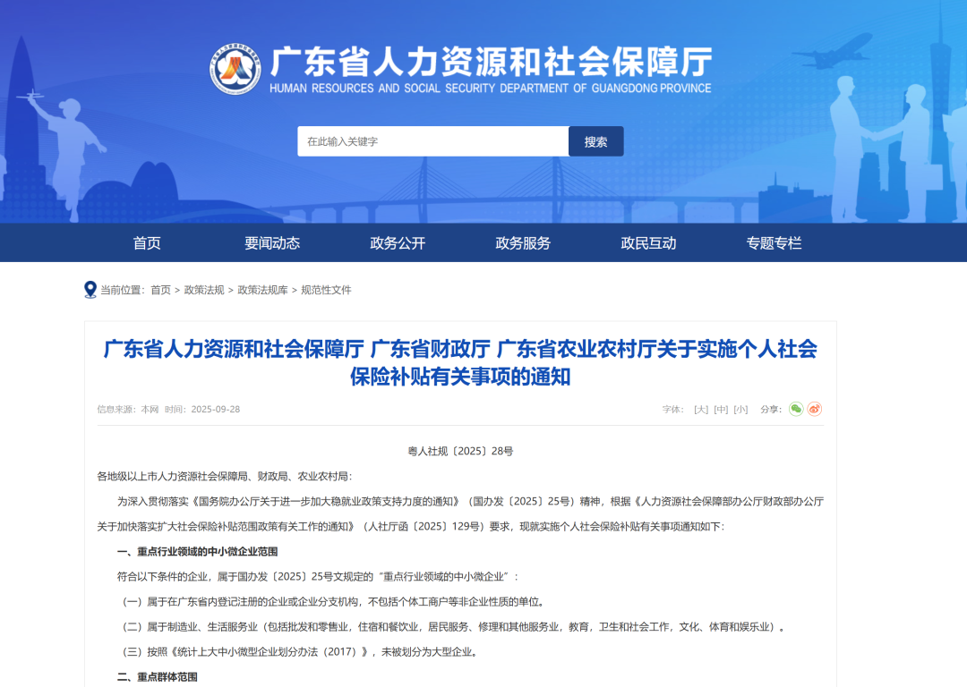 近日,广东省人力资源和社会保障厅联合广东省财政厅、广东省农业农村厅正式出台了《关于实施个人社会保险补贴有关事项的通知》,为重点行业中小微企业及重点就业群体带来重大利好。