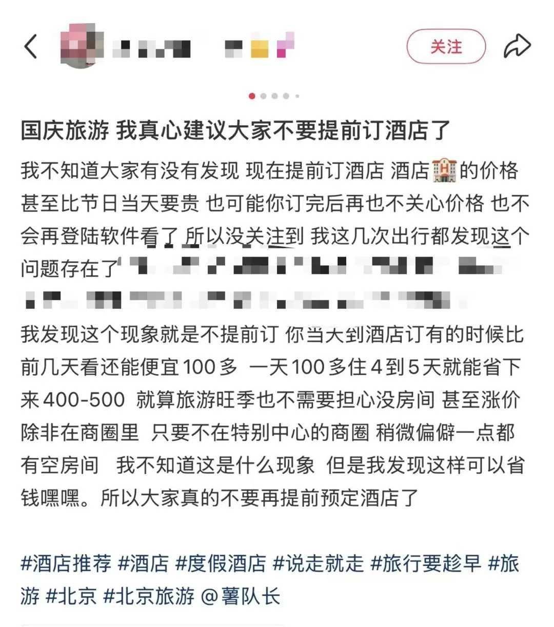 广东某景区酒店老板,本想借国庆黄金周期间大赚一笔,节前从后台看了一眼预定数据,也确实不错,颇有一些供不应求的感觉。