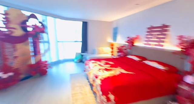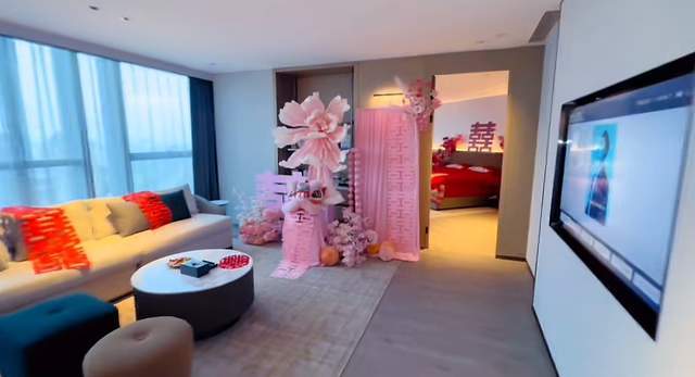 房间中,一张铺满喜被的双人床格外引人注目,周边则摆满了鲜花,并贴着巨大的喜字。靠窗的位置还有各种吸引人眼球的装扮,整体简洁却不失喜气。