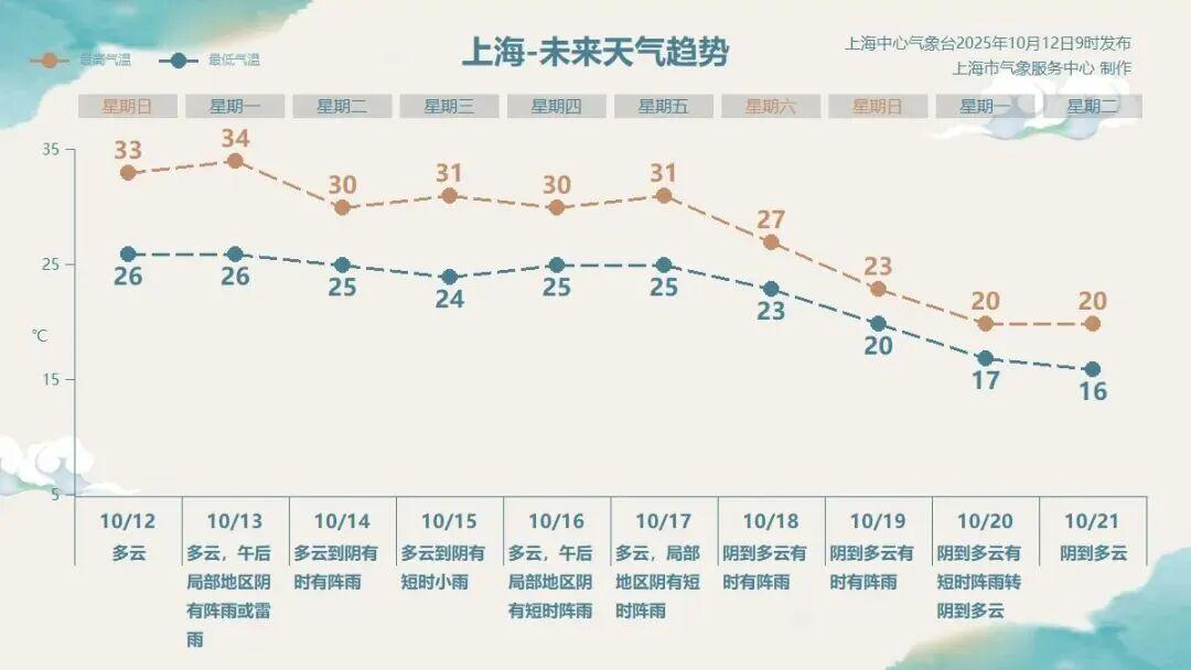 根据天气趋势分析,明天上海的气温依然居高不下,最高气温预计可达34℃,最低气温也有26℃,早晚都不凉快。在高温的条件下,还容易触发午后热对流,导致短时阵雨或雷雨天气,因此大家在外出时务必注意防范。不过,好消息是下周二起,本市的降水将增多,气温也会略有回落。特别是下周六前后,受冷空气的影响,风力将增大,同时气温将明显下降,最高气温有望降至“2”字头,届时上海很有可能跑步入秋。