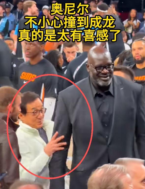 本来只是一场小小的意外,可成龙大哥在被撞了之后,竟然还贴心地给奥尼尔拍了拍胳膊,就好像奥尼尔的胳膊被他撞“疼了”一样,这一幕属实有些喜感。